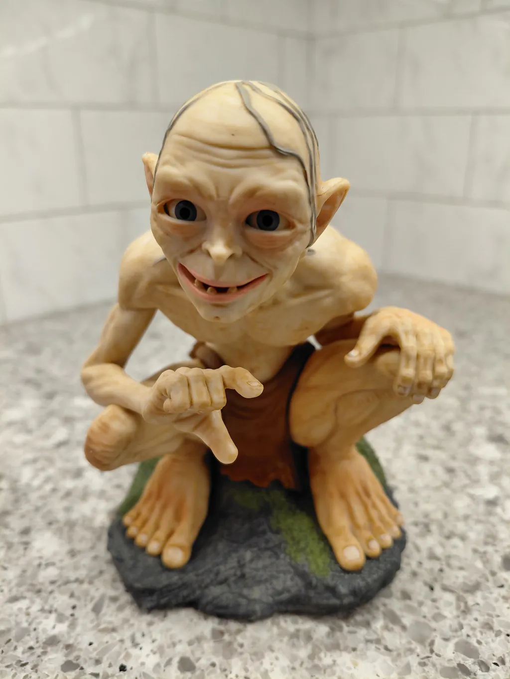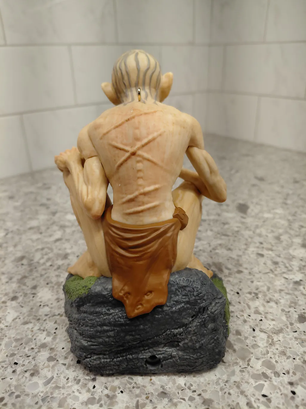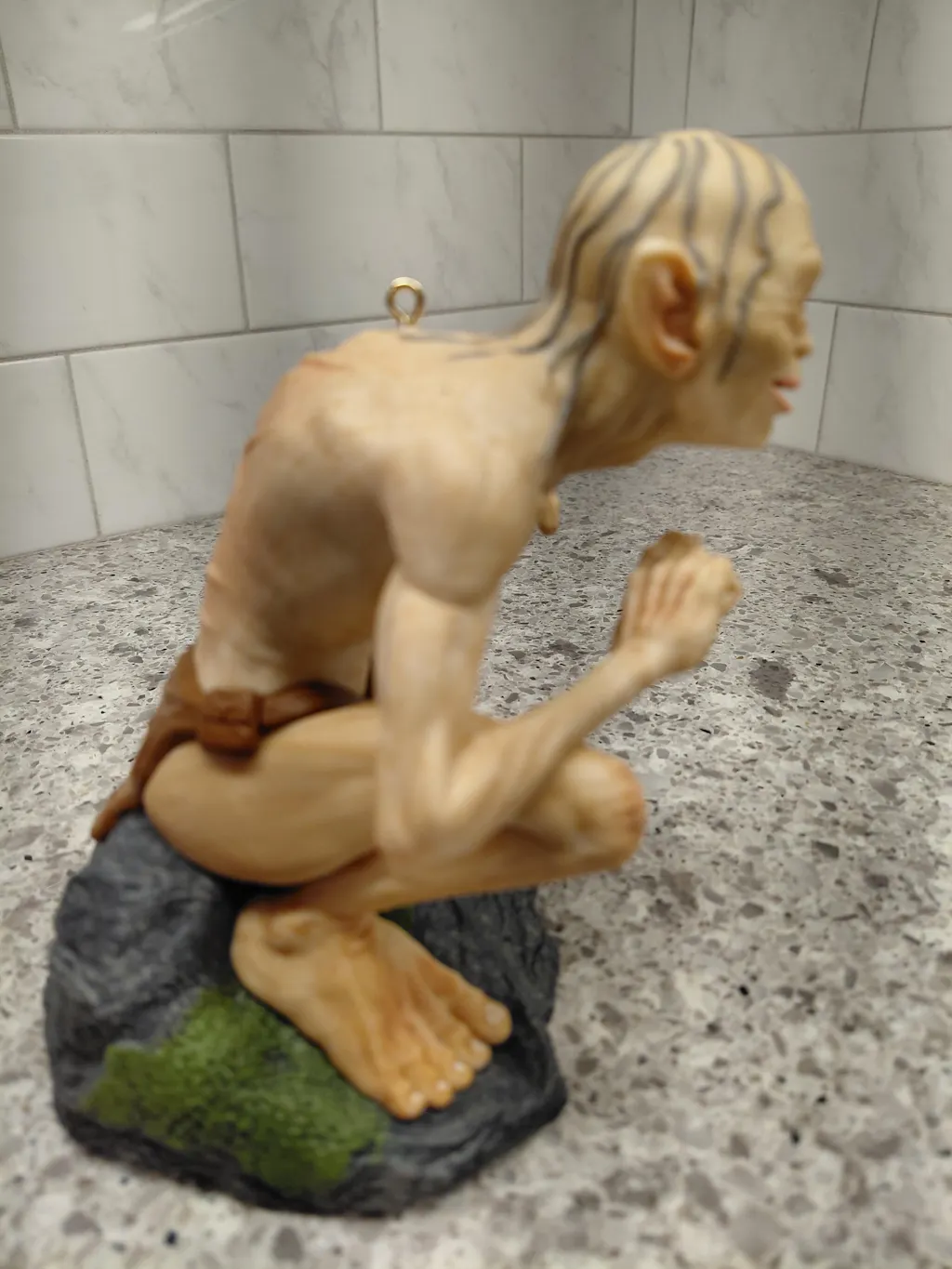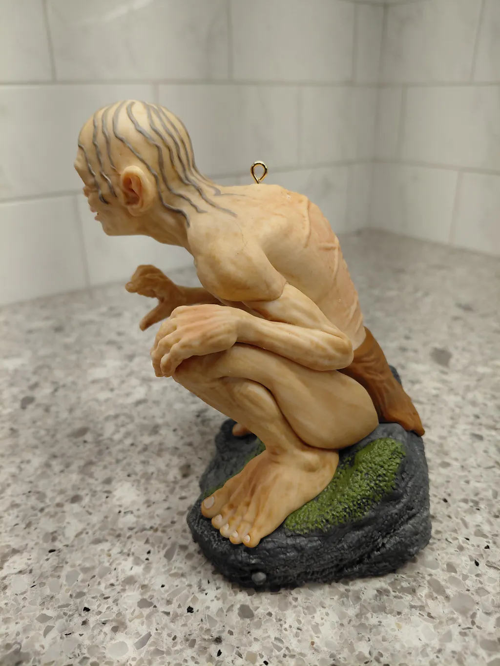 Corrupted by the One Ring in "Lord of the Rings," Gollum relentlessly seeks his most precious possession. Recall his tragic journey with this Christmas tree ornament featuring a lifelike, dimensional design of the former hobbit Sméagol, gaunt from his ruinous pursuit, as he hunches on a mossy rock, pointing ahead and revealing his wretched thoughts. Press the button to hear Gollum speak in hoarse, hushed tones as his eyes flutter and his mouth moves. Requires Hallmark's Keepsake Power Cord (sold separately).